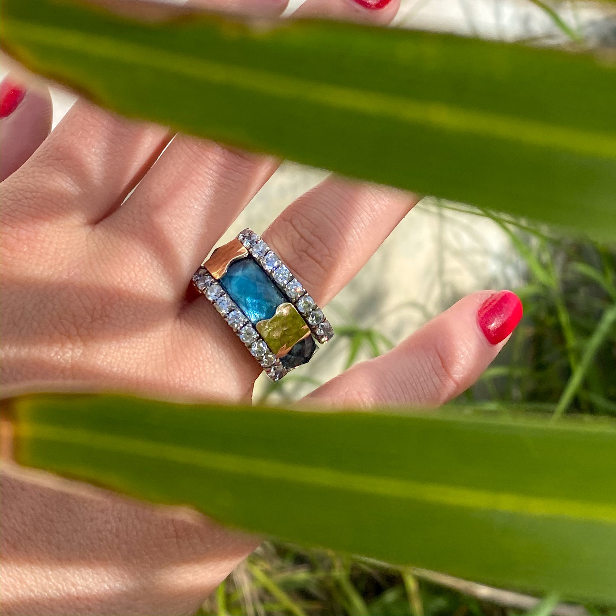 Aliança Ouro e Prata Topázio Azul Intercalado Quadrado Folheado Ouro A155