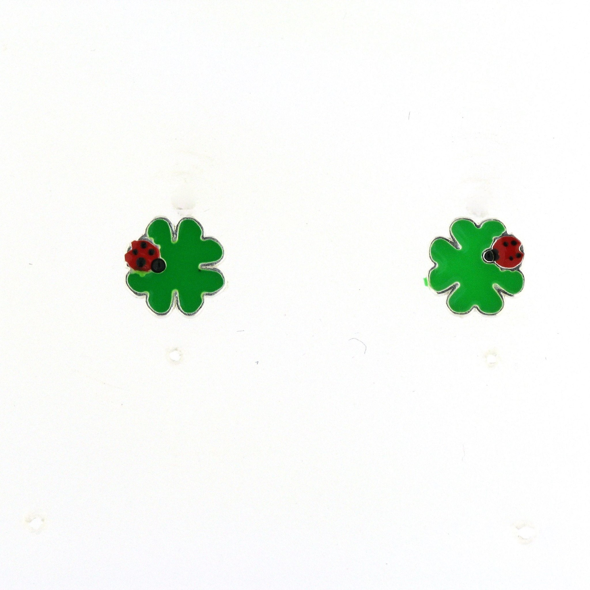 Brincos Criança. Folha Trevo Joaninha Esmalte Rosa e Vermelho A047012