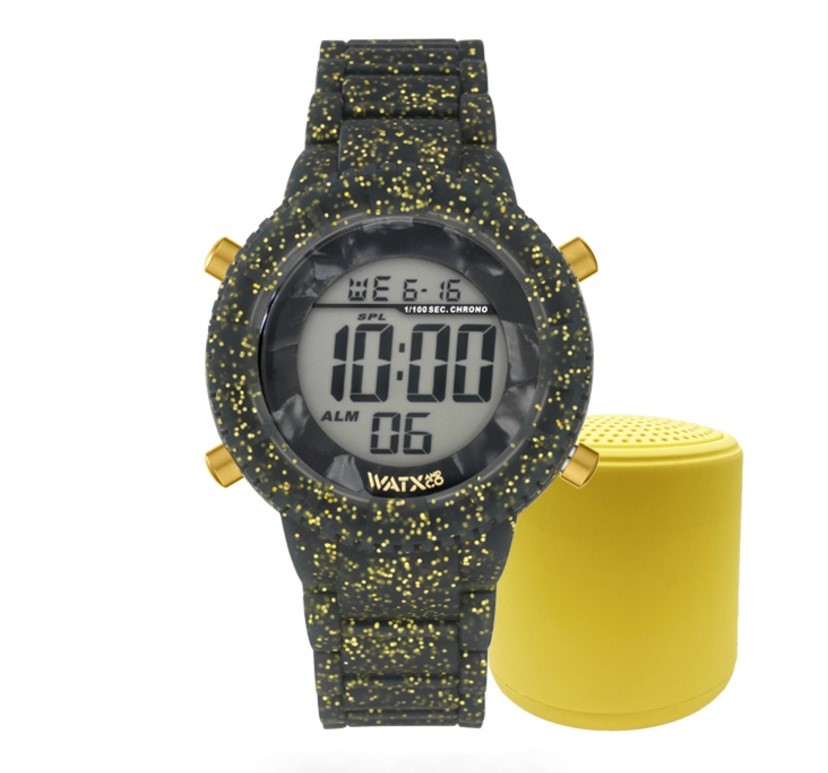Pack com relógio Watx da colecção Sparkling em silicone e coluna sem fios (ligação por Bluetooth) em amarelo. O presente perfeito para qualquer ocasião.