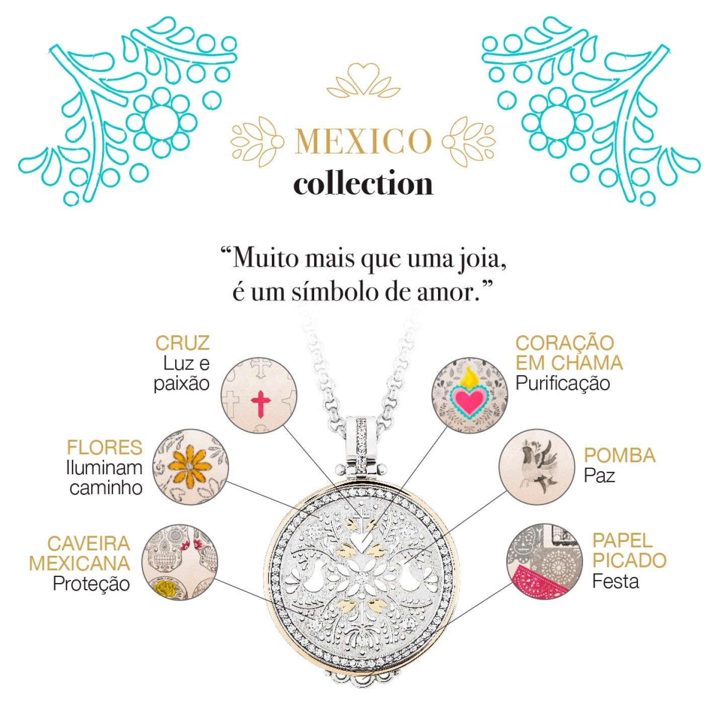 México é uma coleção inspirada numa das mais alegres e populares festas mexicanas – O Dia De Los Muertos. Nesta festa, segundo a tradição, aqueles que já partiram têm a permissão divina para visitar os seus parentes. Para esta união acontecer os familiares colocam a fotografia e oferendas para a pessoa amada. Enquanto ela for lembrada viverá para sempre. Por este motivo esta joia guarda um segredo muito especial, no verso do pendente está gravada a frase “Enquanto alguém se lembrar de mim, eu existo”.