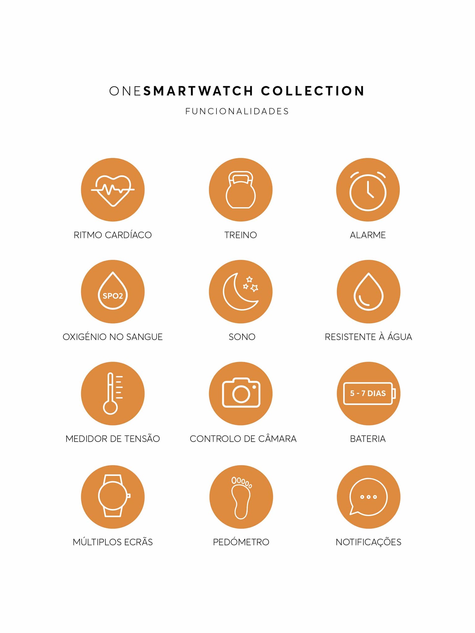 FUNÇÕES Alarme, Ritmo Cardíaco, Treino, Notificações, Oxigénio no sangue, Sono, Resistente à água, Pedómetro, Medidor de Tensão, Câmara, Bateria até 7 dias, Múltiplos Ecrãs